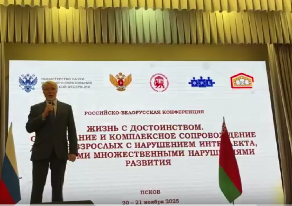 Председатель МОО « Равные возможности» Андрей Михайлович Царев с приветственным словом на Российско- Белорусской конференции в Пскове