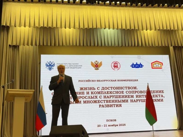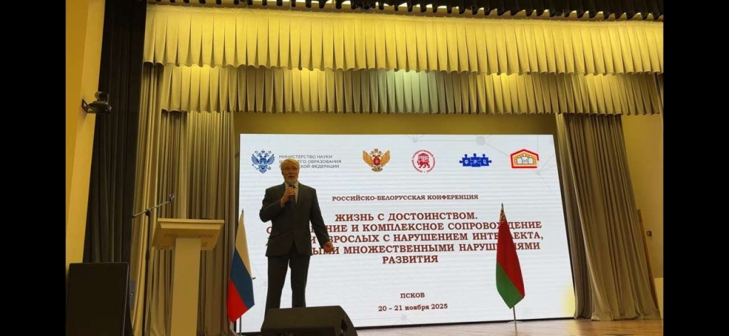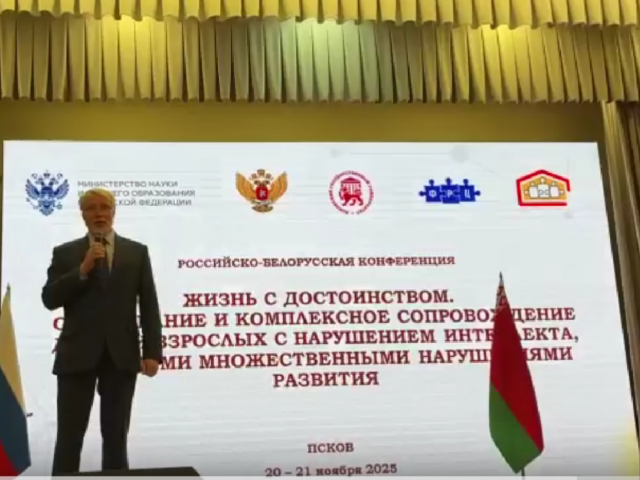 Председатель МОО « Равные возможности» Андрей Михайлович Царев с приветственным словом на Российско- Белорусской конференции в Пскове